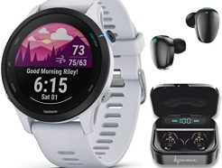 Garmin Forerunner 255 Music GPS Running Smartwatch, Advanced Insights, Long-Lasting Battery, Whitestone with Wearable4U Black Earbuds Bundle