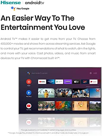 The A4H comes loaded with more technology than some would expect in such a compact tv. The voice remote gives quick access to the built-in Google Assistant, opens the door to a vast library of content, as well as, gives the user voice control over tv functions. Motion Rate 120 ensures that content motion is smooth and distinct with less blurring. This feature is important for the tv’s game and sports modes which adjust the tv settings for the optimal viewing experience when playing the latest fast-paced games or watching fast-action sports content. The A4H also comes with DTS Virtual:X for a more robust audio experience. For the consumer in the market for a smaller size television that still packs a punch, look no further than the A4H. Android TV makes it easier to get more from your TV. Choose from 700,000+* movies and shows from across streaming services. Ask Google to control your TV, get recommendations of what to watch, dim the lights, and more with your voice. Cast photos, videos, and music from smart devices to your TV with Chromecast built-in.