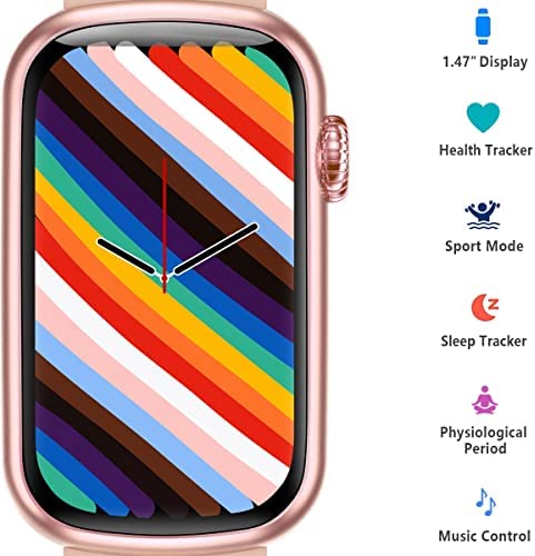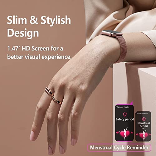 💓【Slim Fitness Tracker & Various Features】- 1.47 large color screen and full screen touch for a better visual experience. Choose from a wide array of colors and customize your cover screen so your watch fits your style. Switch the UI style by twisting the button to fit you. Watches for women also features with message notifications, weather, drink and sedentary reminder, music control, and female menstruation period reminder.