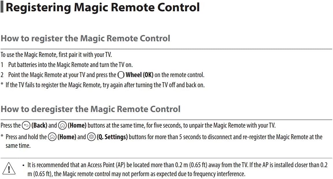 Replacement Remote Control Controller For LG OLED Evo C2 Series OLED55C2PUA 55”, OLED65C2PUA 65” 4k Smart TV (2022) Compatible with LG 4K Smart OLED TV models: OLED48A1AUA OLED48A1PUA OLED48C1AUB OLED48C1PUB OLED55A1AUA OLED55A1PUA OLED55B1PUA OLED55C1AUB OLED55C1PUA OLED55C1PUB OLED55G1PUA OLED65A1AUA OLED65A1PUA OLED65B1PUA OLED65C1AUA OLED65C1AUB OLED65C1PUB OLED65G1PUA OLED77A1AUA OLED77A1PUA OLED77B1PUA OLED77C1AUA OLED77C1AUB OLED77C1PUB OLED77G1PUA OLED83C1AUA OLED83C1PUA RCLLGEMR21GA RCLLGEMR21GA Power Supply: 2X 1.5V AA Alkaline Battery Package Content: 1X Remote Control (Battery and User Manual Not Included) *************** How to register the Magic Remote Control To use the Magic Remote, first pair it with your TV. 1 Put batteries into the Magic Remote and turn the TV on. 2 Point the Magic Remote at your TV and press the Wheel (OK) on the remote control. * If the TV fails to register the Magic Remote, try again after turning the TV off and back on. *************** How to deregister the Magic Remote Control Press the (Back) and (Home) buttons at the same time, for five seconds, to unpair the Magic Remote with your TV. * Press and hold the (Home) and (Q. Settings) buttons for more than 5 seconds to disconnect and reregister the Magic Remote at the same time.