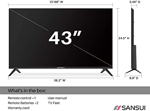 📺【Multiple Inputs and Outputs】- SANSUI TV 43 inch offers variable inputs and outputs including 3x HDMI, 2x USB, 1x AV IN, 1x Earphone, 1x RJ45, 1x optical, 1x ATV & DTV. SANSUI 43 in TV package includes Remote control* 1, Remote Batteries* 2, HDMI Cable*1, User manual, TV Feet and warranty card.