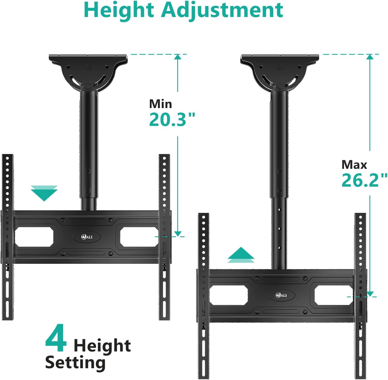 Adjustment: Tilt down 25°, Left-right swivel range of 360°, Rotate both ways 3°. 4 height adjustment of 20.3, 22.2, 24.2, 26.2 inch from ceiling to center of mounting plate for the perfect viewing angles.