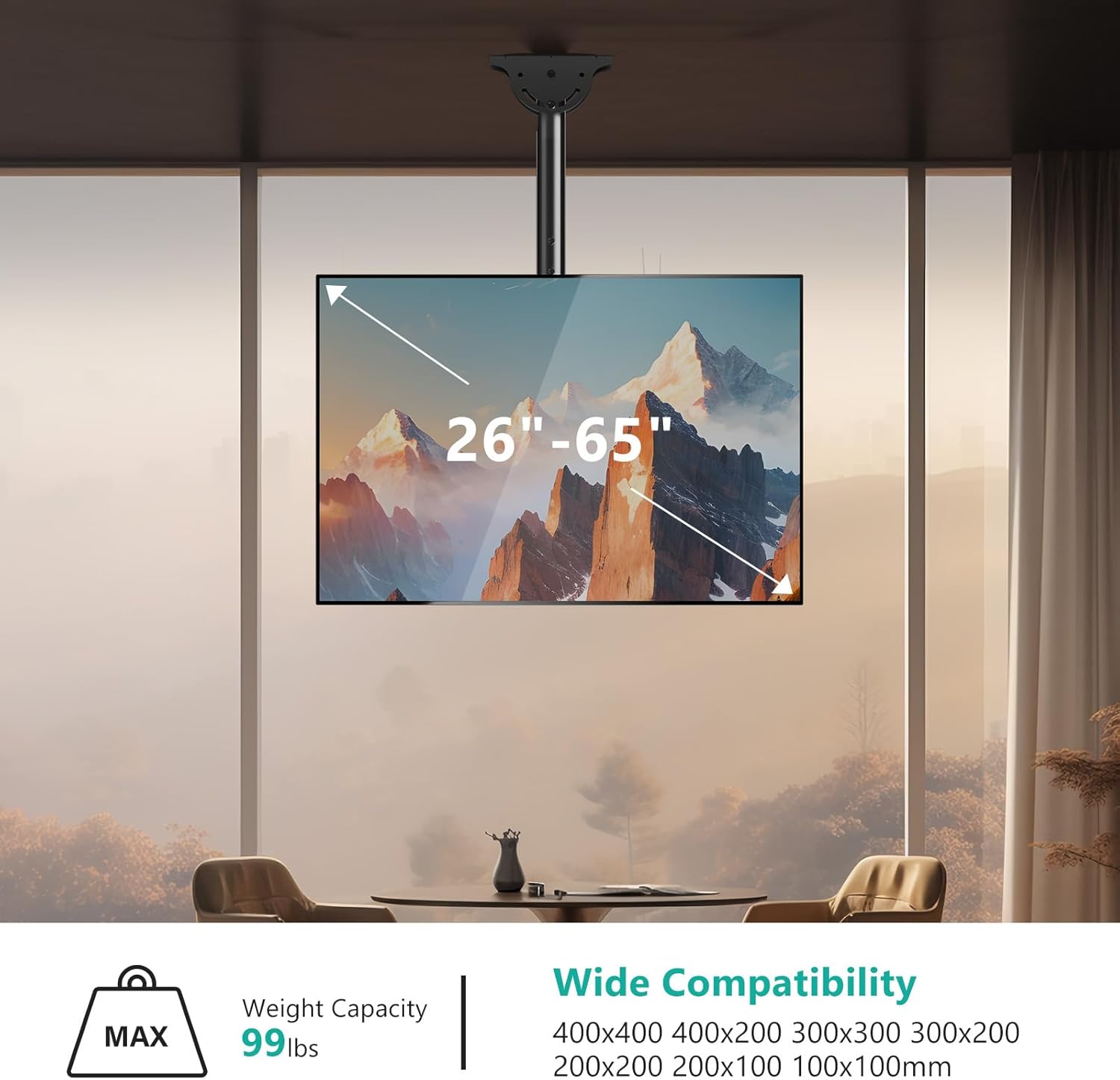 Compatibility: Fits most displays up to 65 inch, 99 lbs. Mounting hole pattern: 400×400 400×200 300×300 300×200 200×200 200×100 100x100mm.